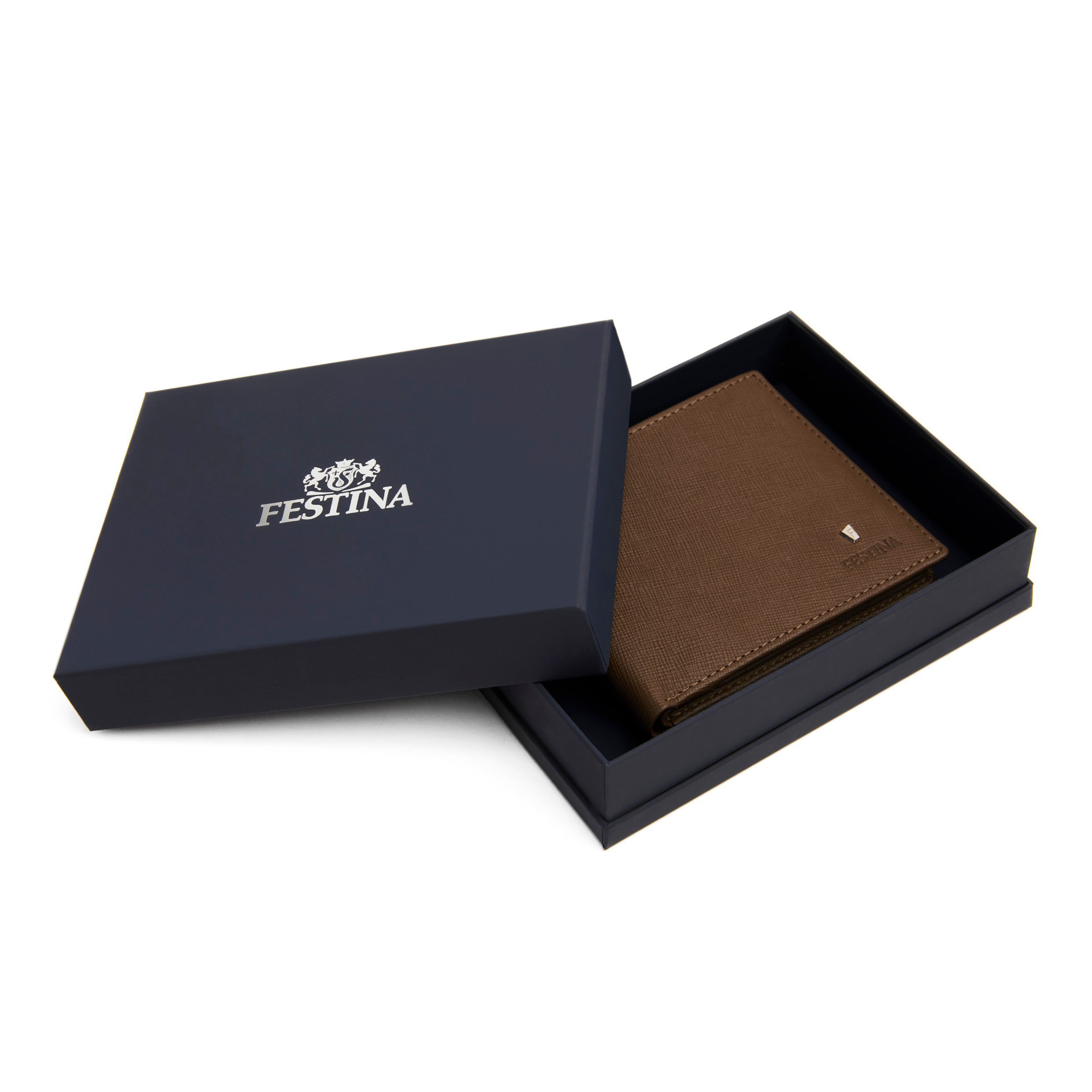 The “Chronobike” small leather goods line is made of carefully chosen genuine leather, with a safiano texture. This new camel version is adorned by a crisp chrome signature, for a timeless look. The iconic signature, the trapezoidal shaped F logo, has been reduced to the smallest possible scale, to give the line a luxuriously finished touch, while allowing for optimal use. It is underlined by a beautifully embossed Festina logo. This card wallet is minimal, compact and highly practical, with a total of 12 card slots, and a banknote compartment separated in 2.
