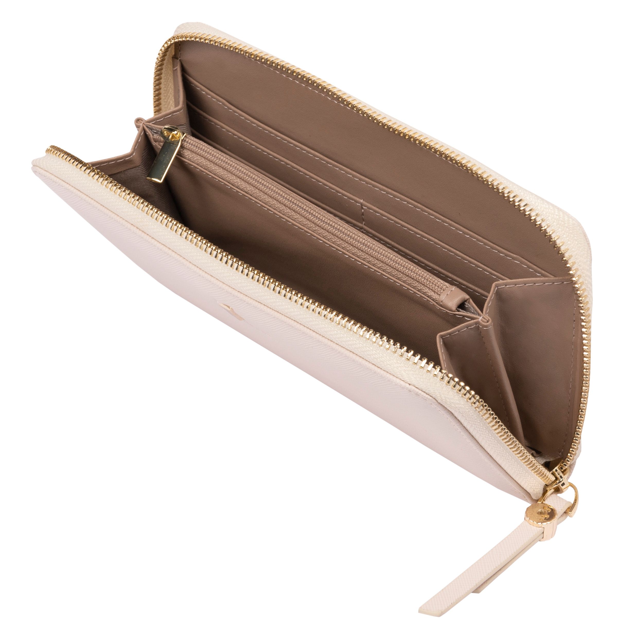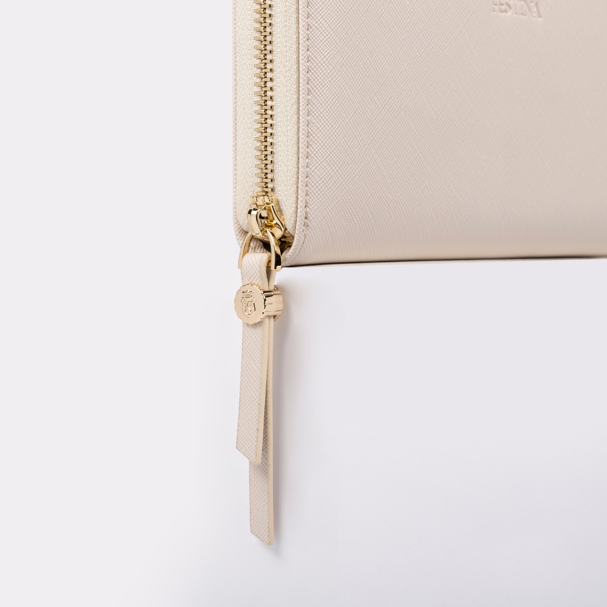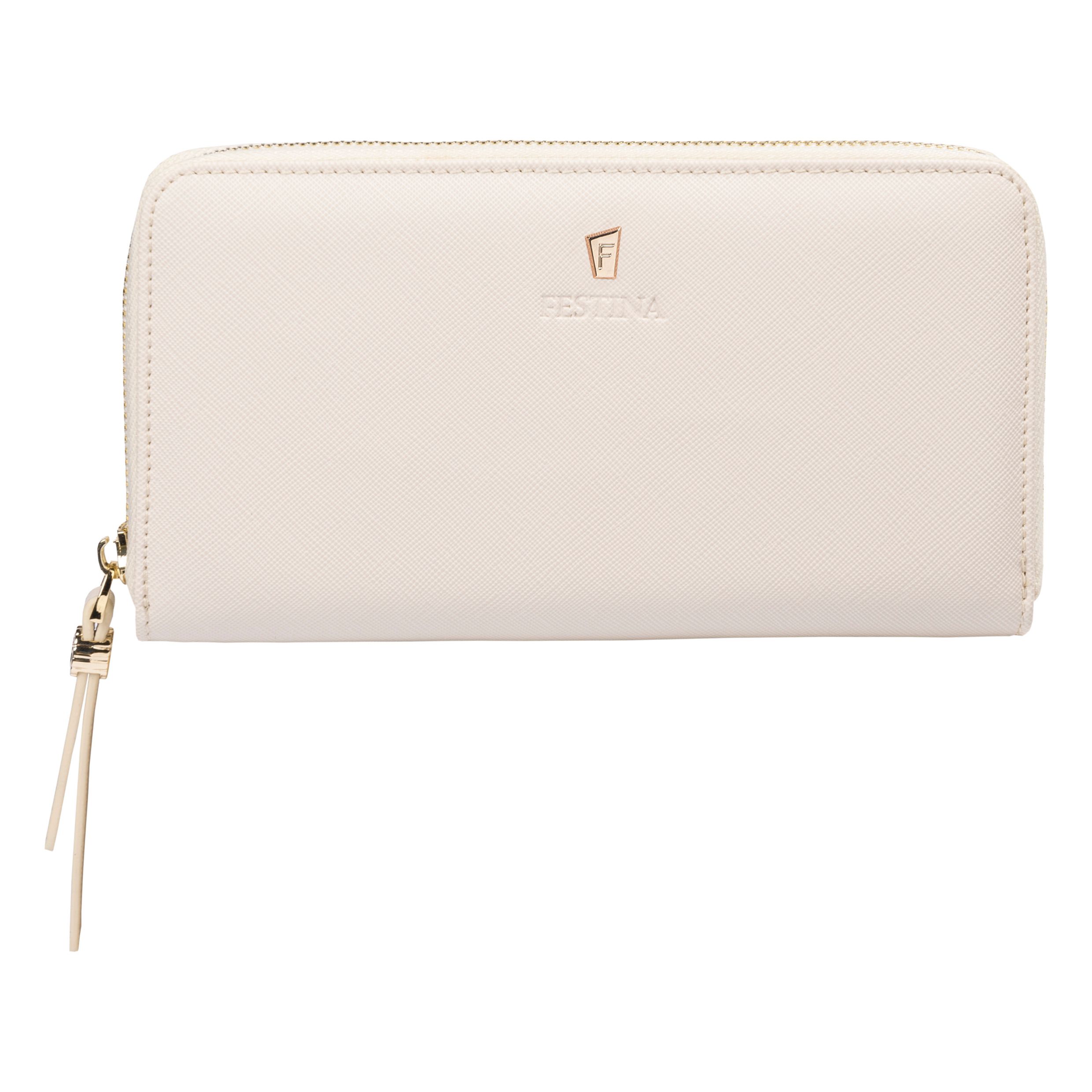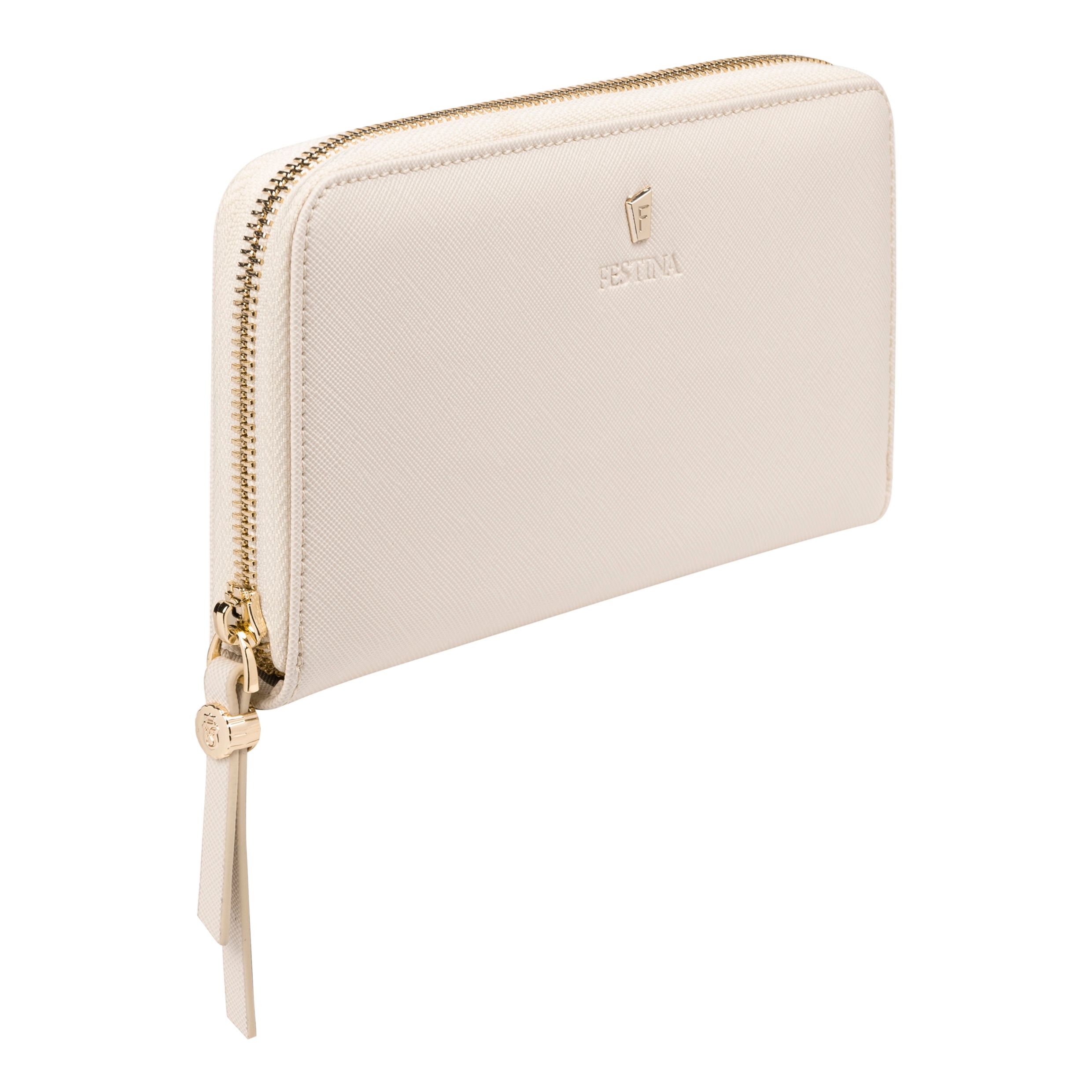 The “Mademoiselle” lady wallet is made of beautifully textured saffiano vegan leather (PU). Each detail is delicately crafted, like the zipper pullers, adorned with the Festina Blazon and inspired by the brand iconic watch stop buttons. Beautifully crafted, the product features colorful, contrasted and highly practical interiors. This off-white version has a contrasted beige interior. Each wallet is finished with a finely embossed Festina signature, underneath a golden version of the luxurious “F” plate.