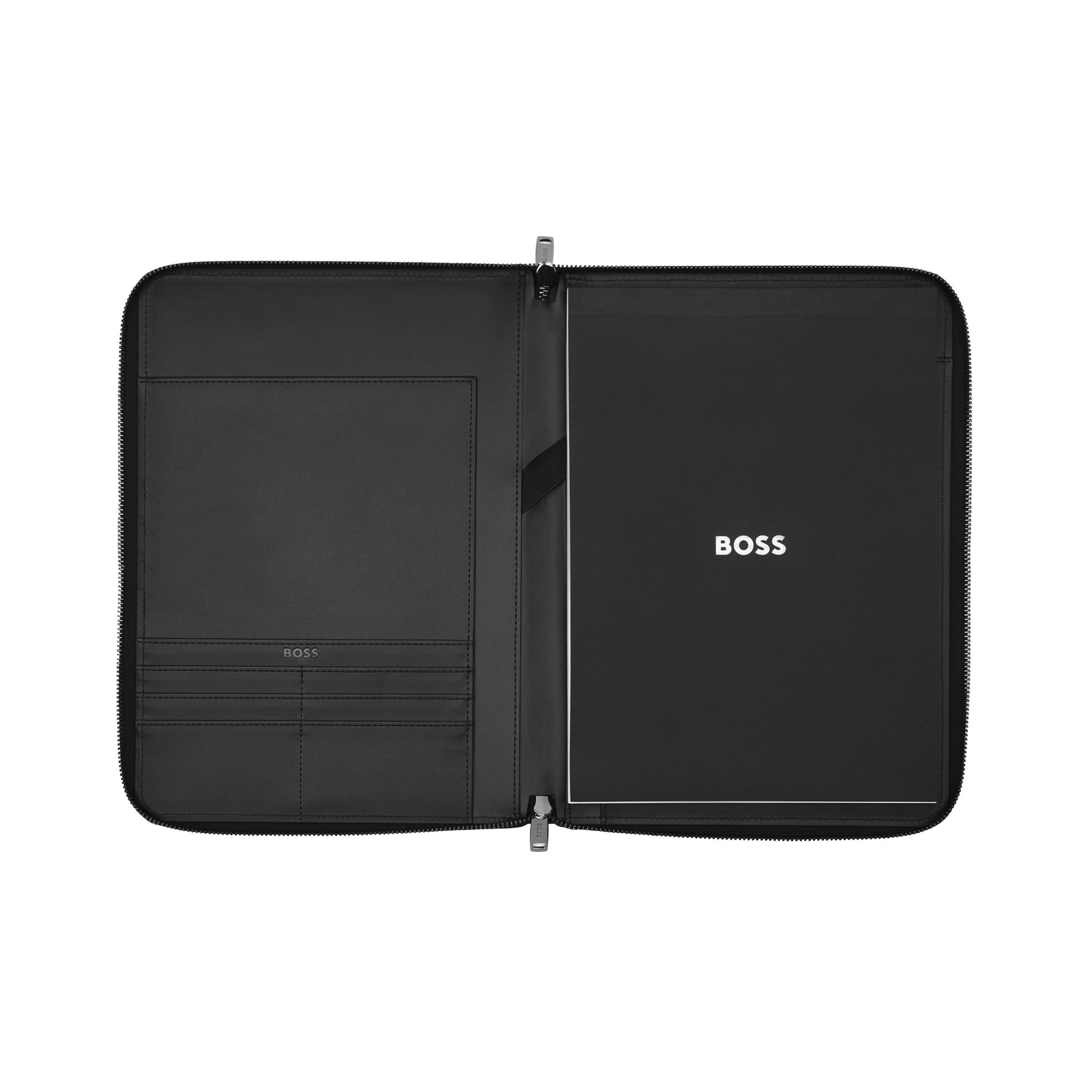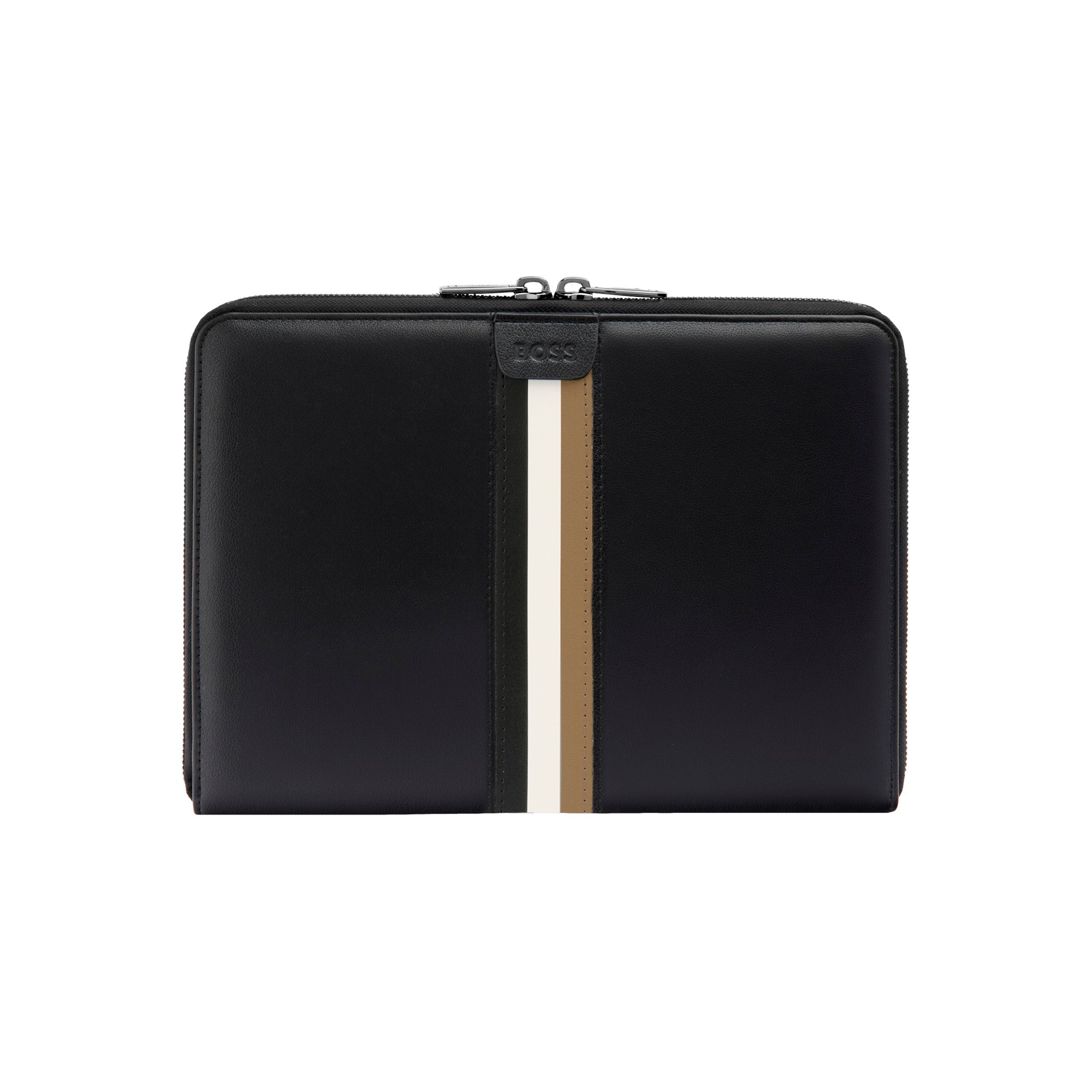 Also This A5 folder from BOSS combines an active-inspired design with a luxurious approach. Made from smooth, soft black PU, it features a printed 3-color iconic stripe element at the center. The BOSS logo is embossed on a tag adorning the stripe, and the folder is finished with gun-plated metal zippers, engraved with the BOSS logo. Perfect for brand enthusiasts, this folder combines style with practicality for everyday use.
