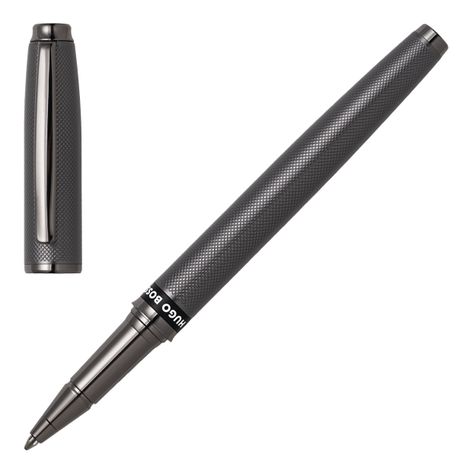 The Stream rollerball pen is a sleek and modern writing instrument designed to provide a balanced writing experience. It features a new silhouette that combines simplicity and modernity. The pen is adorned with an engraved pattern that is plated in a luxurious matte gunmetal finish, providing an elevated haptic sensation. The black and white logo ring adds a touch of playful graphical element to the design. Offered in a luxurious fully recyclable, black packaging.